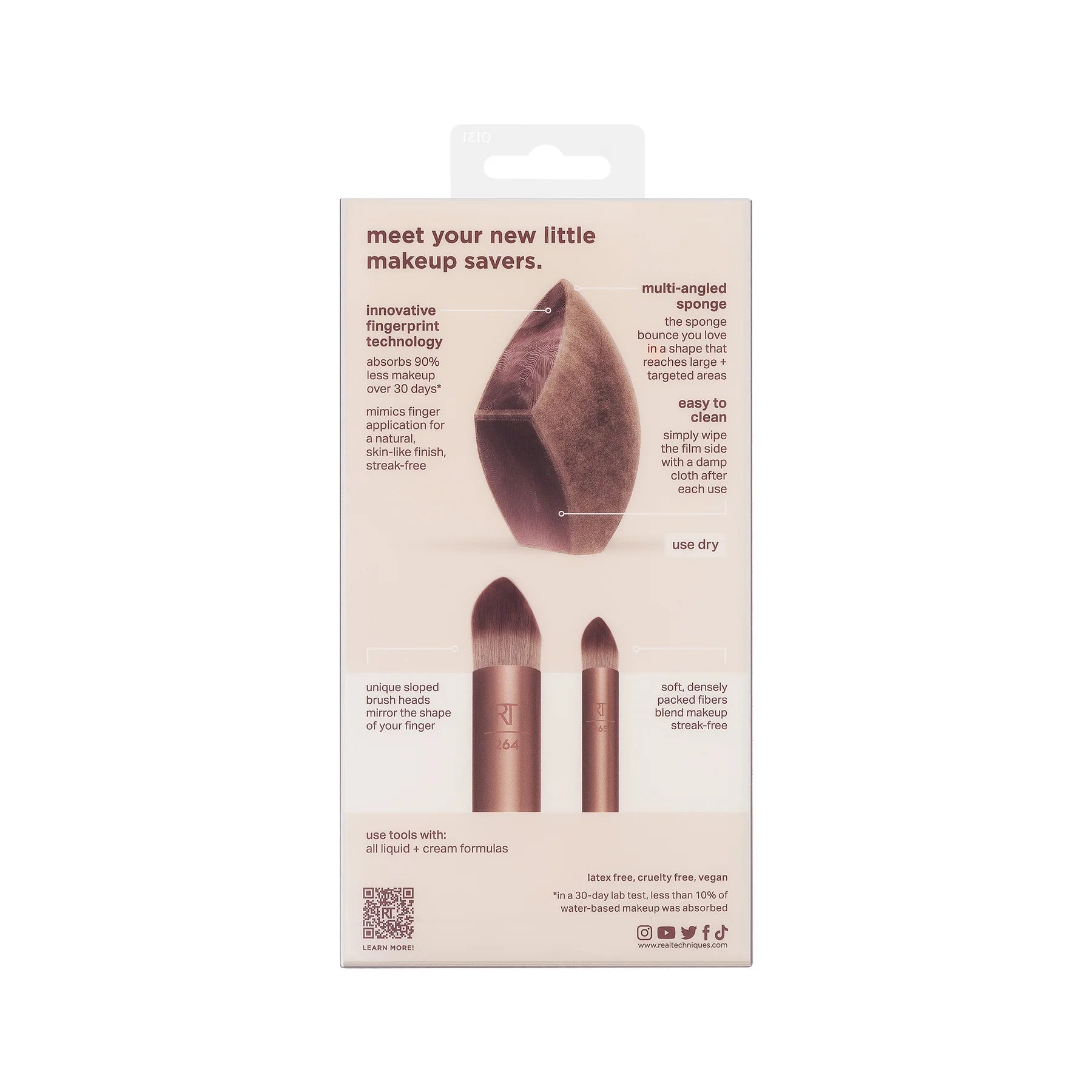 The Real Techniques Makeupsaver Sponge + Brush Trio features the Makeupsaver Sponge and two makeup brushes that mirror the shape of your fingertip for precise application with a natural-looking finish.